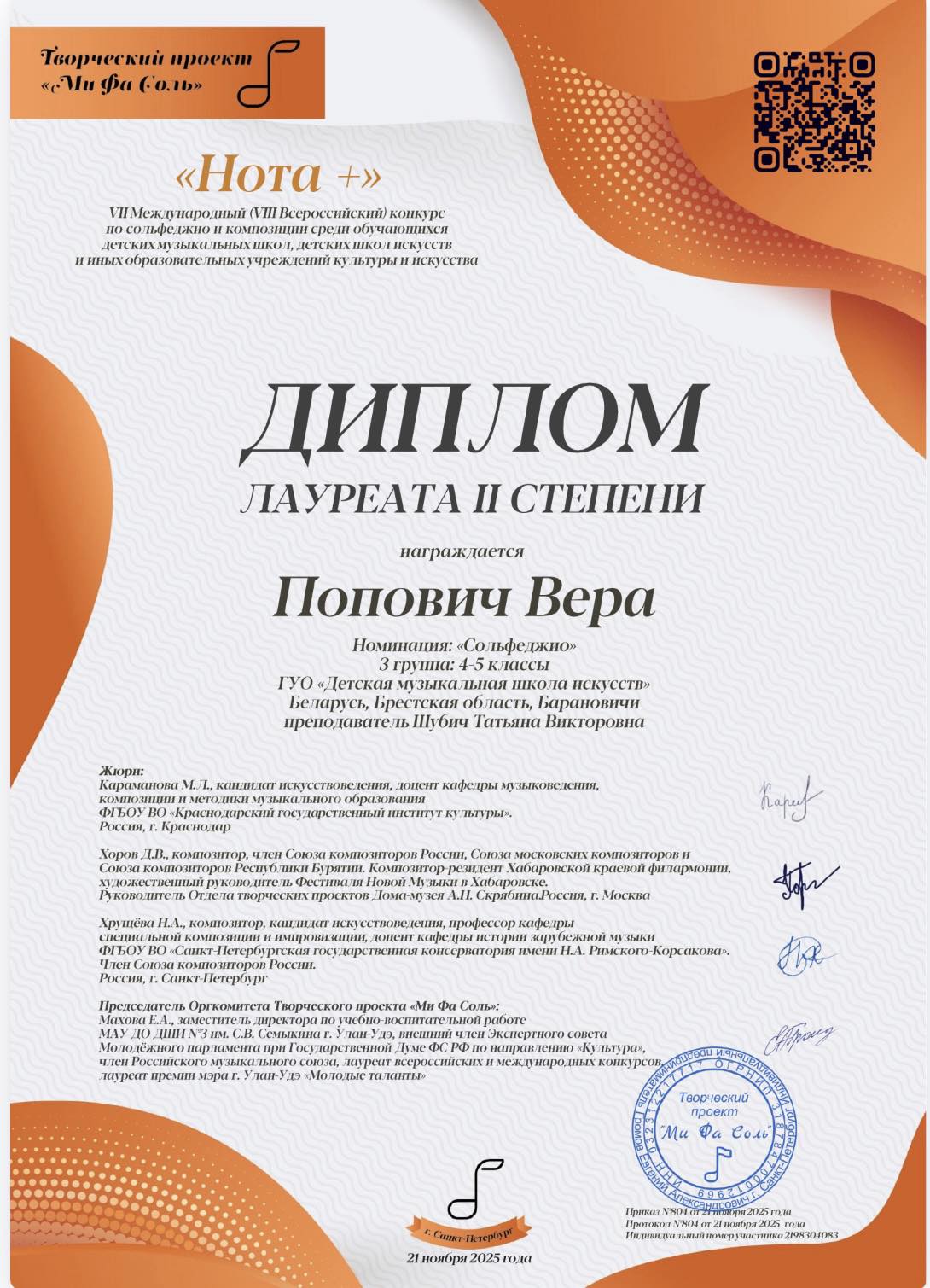Ученица 4 класса Вера Попович стала Лауреатом II степени!!!!